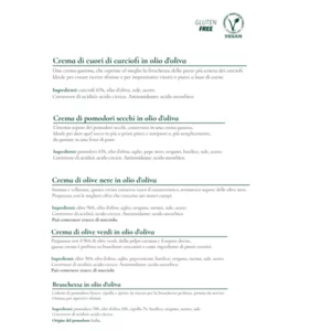 - Crème de tomates séchées : Tomates 85%, huile d'olive 12%, ail, poivre noir, origan, basilic, sel, vinaigre