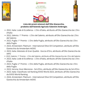 L' huile d'olive extra vierge des Pouilles Gianecchia DOP Collina di Brindisi est une huile d'olive extra vierge DOP à faible acidité, avec un arôme fruité, un aspect trouble, une couleur jaune-vert, une saveur légèrement amère et épicée et l'arôme incomparable d'olives fraîches de la plus haute qualité.