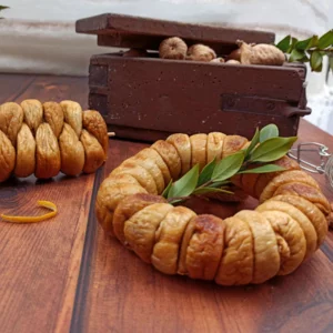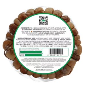 Le cône de figues séchées Valle dei Crati est fabriqué à partir de délicieuses figues, séchées au soleil de Calabre, sélectionnées et transformées à la main, enfilées sur des brins de myrte et cuites au four jusqu'à ce qu'elles prennent une couleur ambrée.