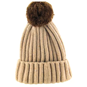 Ce bonnet en laine marron avec pompon est un accessoire chaud et mode, idéal pour la saison hivernale.