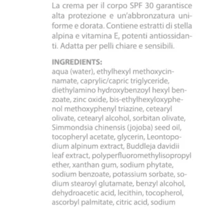 Cette crème pour le corps SPF 30 offre une protection solaire à large spectre, idéale pour une exposition quotidienne au soleil à la montagne, à la mer ou en ville.