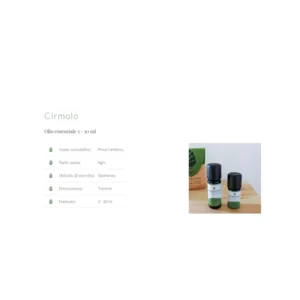 Huile essentielle 100% pure extraite des arbres Cirmolo (pin suisse) du Val di Fiemme avec un effet calmant et balsamique sur les voies respiratoires.