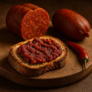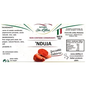 Produit exclusivement à partir de viande de porc noir de Gerace, une race locale prisée, il est fabriqué artisanalement et aromatisé avec du piment calabrais de la plus haute qualité.