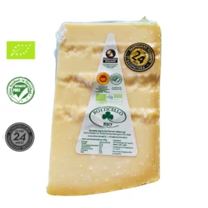 Le Parmigiano Reggiano BIO DOP affiné pendant plus de 24 mois est produit avec du lait biologique sélectionné et du fourrage naturel sans OGM provenant de prairies permanentes et de ray-grass cultivés exclusivement à la ferme.
